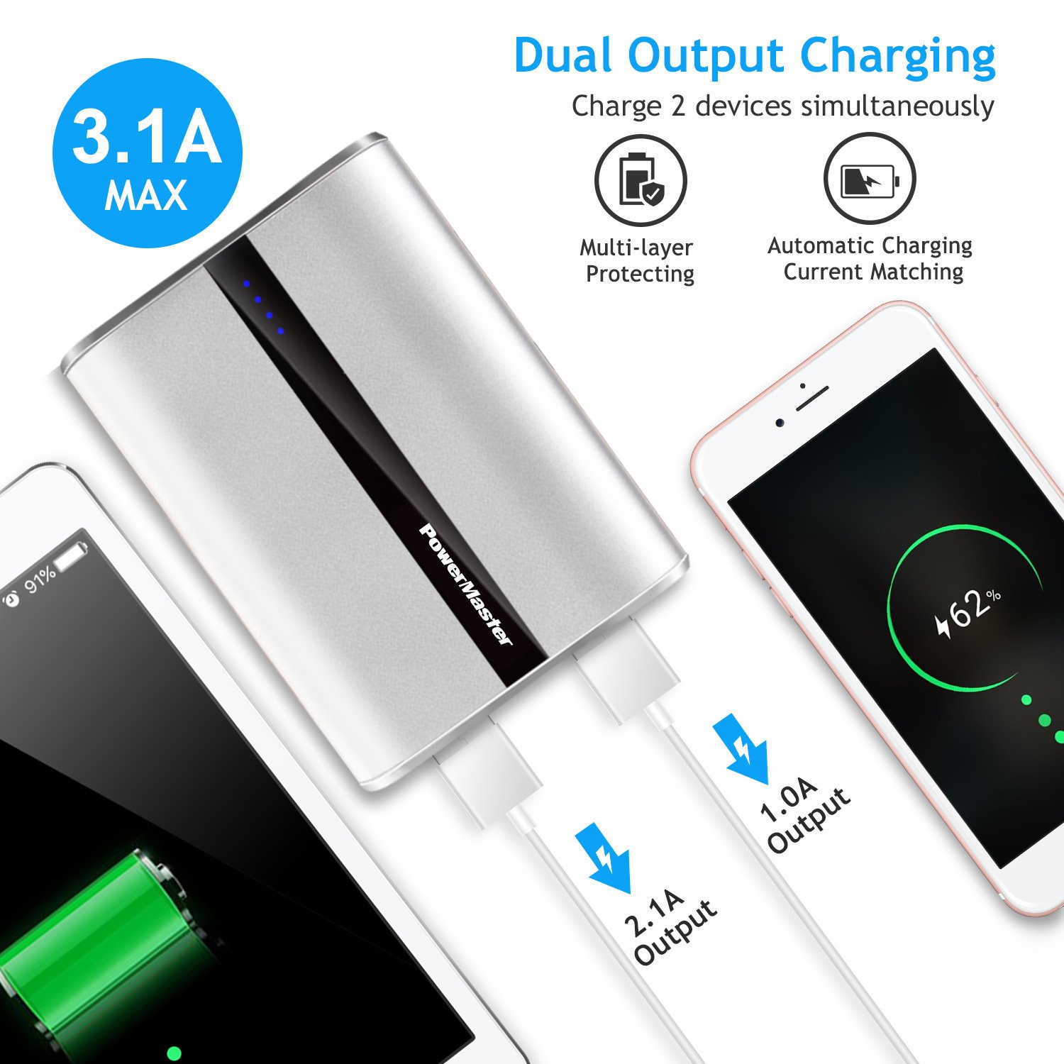 **Dual Output Meets All Charging Needs*:2 USB ports with a powerful total 3.1A output(The one is 2.1A output to fast charging,the other is 1.0A output) keep all of your devices fully powered on-the-go. The inbuilt flashlight makes charging even more convenient in the darkness.
